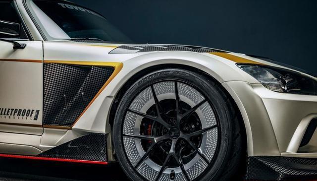 这一身极为个性的涂装,其实是参考了Bulletproof此前基于Scion FR-S(丰田86姊妹车)打造为Concept One 。同时车身底部的黑色碳纤维材质搭配红色细条纹,也几乎与Scion一模一样。